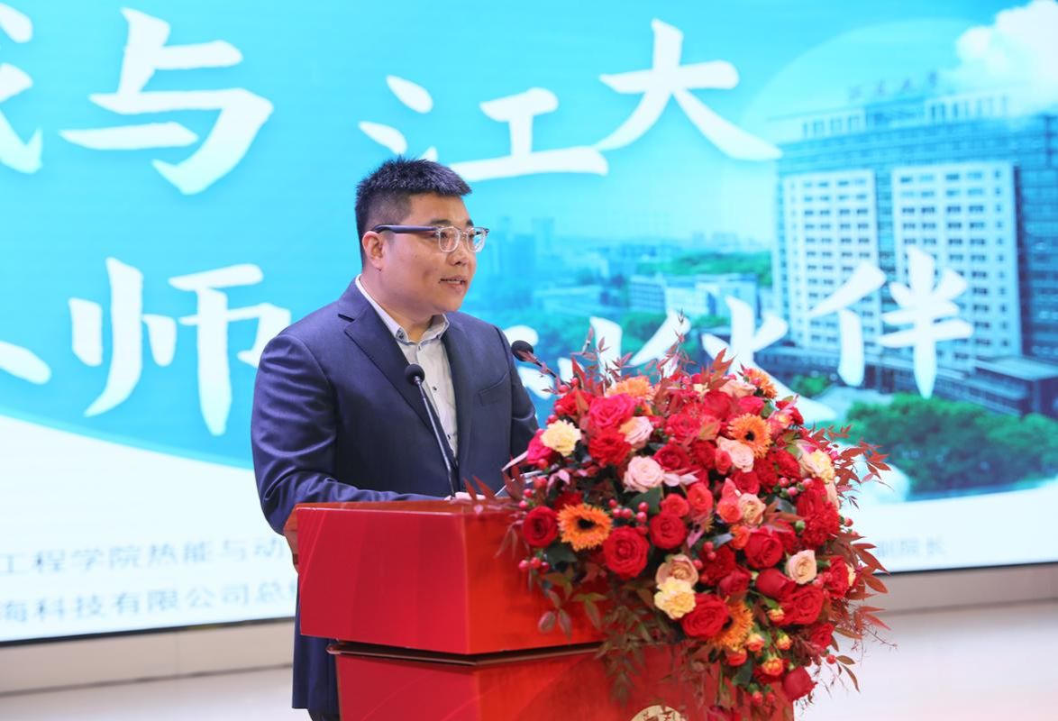 校友代表、热能与动力工程06届校友、北京九州华海科技有限公司总经理、工信部beat365唯一官网新能源汽车专精特新产业学院副院长丁文超以《我与江大,从师生到伙伴》为题作主旨报告,讲述了他毕业后,与母校深度合作,深耕车辆运动与安全电子控制领域,带领公司创新研发,拥有多项核心自主知识产权,打造可持续发展的中国品牌,让中国科技走向世界的故事。