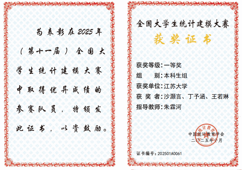 全国大学生统计建模大赛由中国统计教育学会主办,每年举办一届。竞赛经校级选拔、省赛(初审、终审两阶段)、全国评审委员会评审(网评、会评、终审三阶段)。2025年第十一届全国大学生统计建模大赛自2月开赛以来,全国共有885所院校,30941支队伍,92823名大学生参赛。经决赛现场答辩,评选出一等奖90支队伍、二等奖178支队伍、三等奖617支队伍。(数学科学学院)
