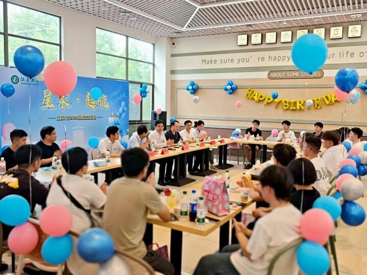 学校食堂内彩色气球点缀,处处洋溢着温馨的氛围。学长学姐们手持“新程灿烂,生日快乐”“江大等你,未来可期”的祝福牌,微笑陪伴在新生身旁,瞬间拉近了彼此的距离。