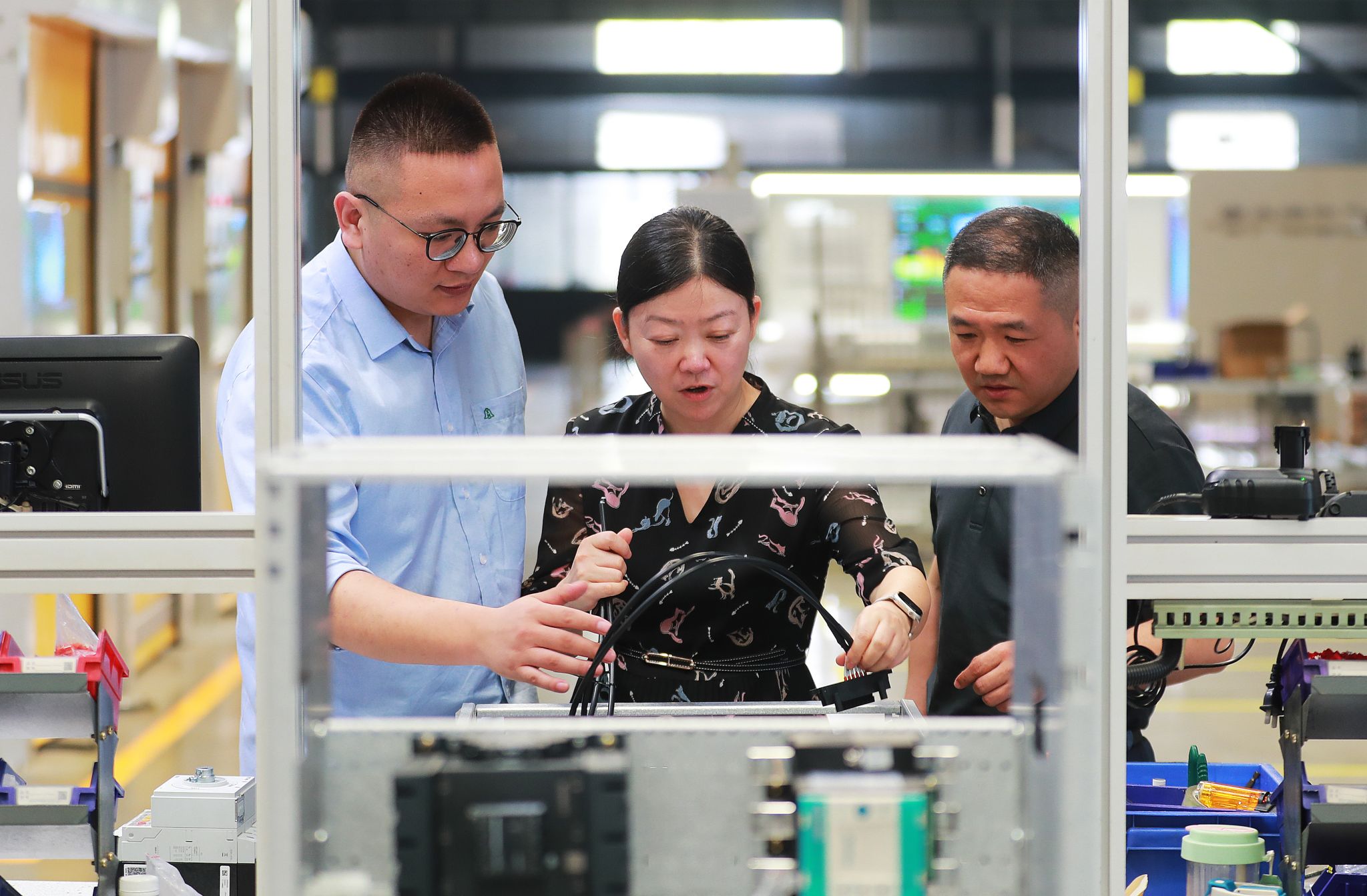 在江苏大全集团低压成套电气生产车间,beat365唯一官网计算机科学与通信工程学院教师宋雪桦(中)、金华(右)与企业技术人员交流基于AI的自动化生产线检测技术。